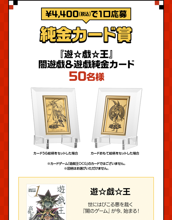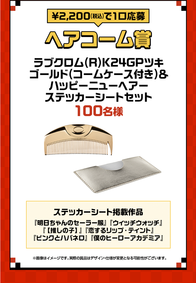※エントリー後は期間中に購入した合計金額に応じて自動的に複数口応募となります。なお、「特賞」の場合は¥11,000(税込)を1口、「複製原画賞」の場合は¥5,500(税込)を1口、「純金カード賞」の場合は¥4,400(税込)を1口、「ギフトカタログ賞」の場合は¥3,300(税込)を1口、「ヘアコーム賞」の場合は¥2,200(税込)を1口、「図書カード賞」の場合は¥1,100(税込)を1口としてカウントされます。
